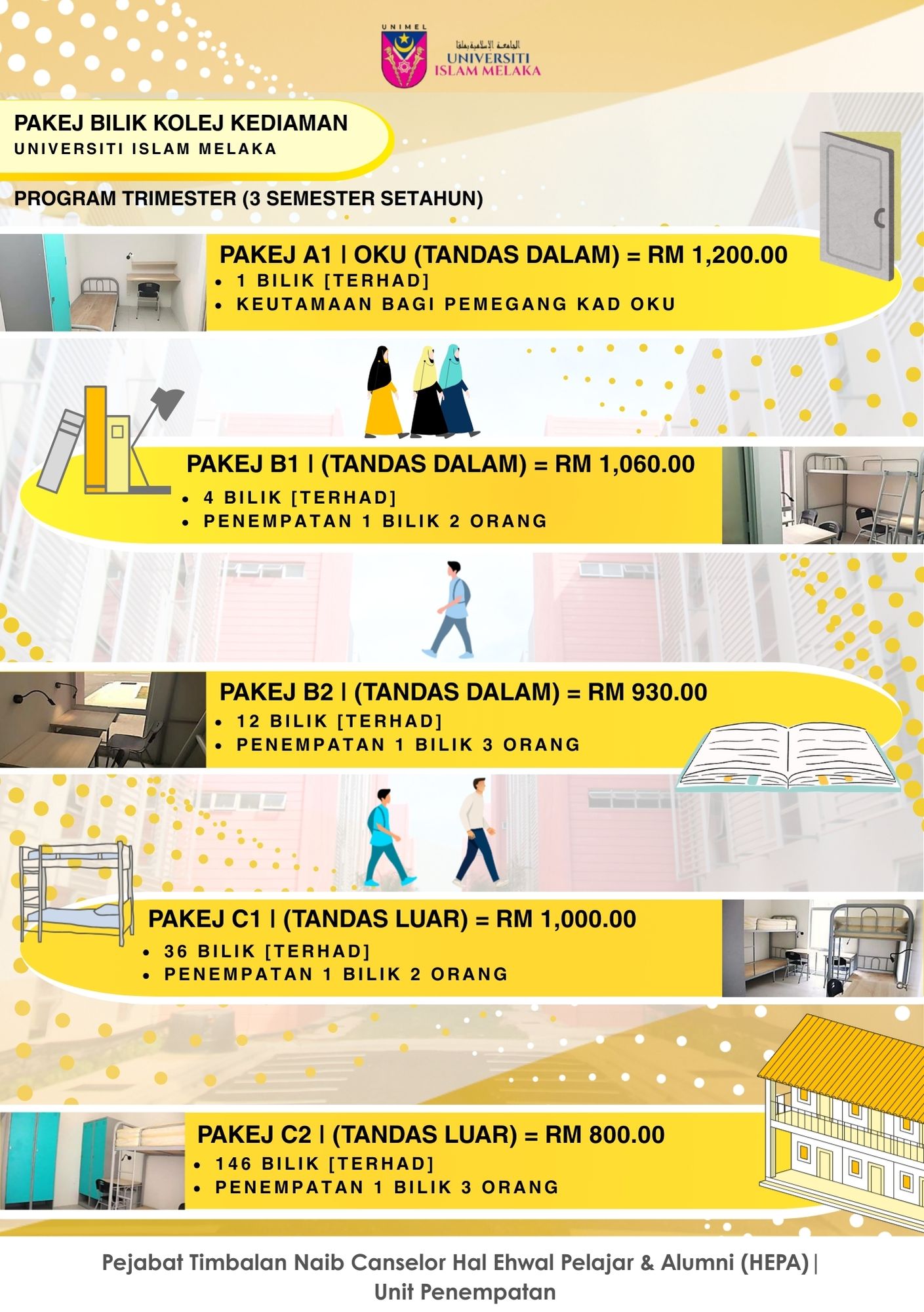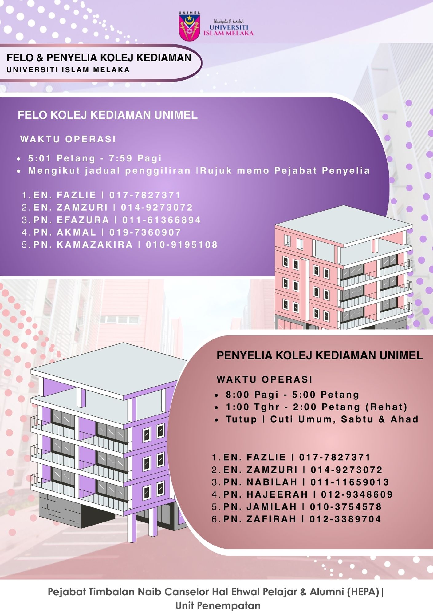 keselesaan kepada pelajar. Selain itu, unit ini juga sangat menitik beratkan keadaan bangunan yang kondusif serta persekitran asrama yang baik bagi menjamin keselamatan dan semangat pelajar untuk terus belajar. Adalah dimaklumkan semua pelajar adalah diwajibkan untuk menginap di Kolej Kediaman dan tidak boleh keluar atau menyewa sendiri di luar kecuali bagi kes tertentu.